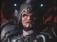 Close on Grimlord, talking as his eyes glow red, then his right fist clenches and glows red as well. |