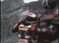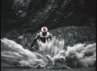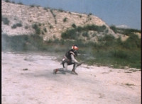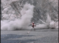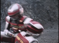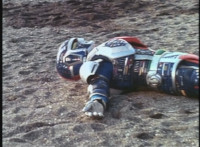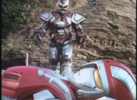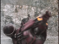 VR JB fires lasers from his Fighterbike in Skycycle mode down upon the cliff, bursting all over it as VR Kaitlin continued to plummet over the side. VR JB flies his Fighterbike under her and catches her on the back of it, before landing and driving to a stop in the quarry below. He gets off, then scoops her lifeless body off of the back of the bike, and gently lays her on the ground. |