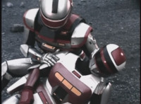 As the smoke clears, VR JB leaves the unconscious VR Kaitlin on the ground, then races forth with his saber in hand, slashing at Footbot, who blocks the blow, then strikes back, flipping VR JB over for a moment, but he gets back up, another failed slash leads to Footbot tackling him and flipping him overhead. Footbot then charges at VR JB, knocking him down again, before coming back at him and doing the same, before finally tackling VR JB one more time, knocking him down once more. |