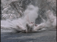 An explosion erupts in the quarry, sending VR Kaitlin flying away, falling and rolling. |