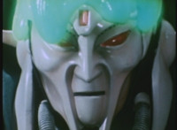 Close-up of Colonel Icebot, as green slime pours down his forehead. |