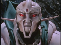 Sharp zoom in close on Grimlord, talking as his eyes glow red, then his right fist clenches and glows red as well. |