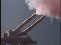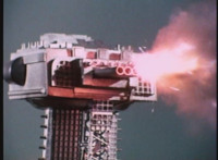 Struck by a pair of missiles, a mountaintop turret explodes, twice. |