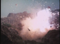 An explosion in a mountain valley, followed by the explosion of a pair of gray boxes. |