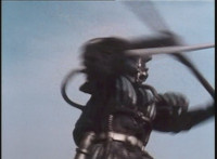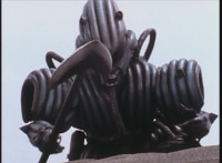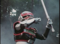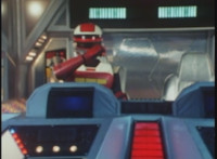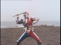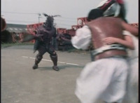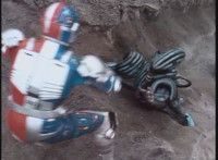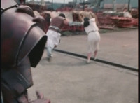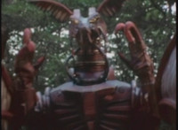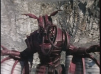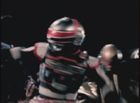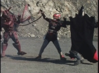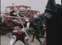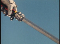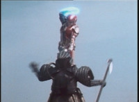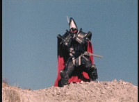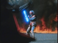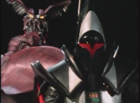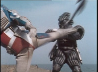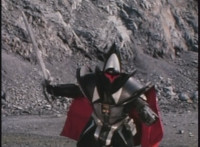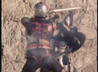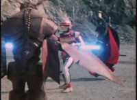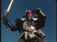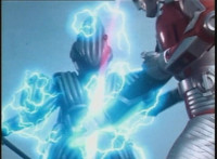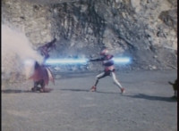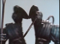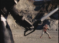 General Ivar and Terminoid race forth. VR JB uses his laser lance to slash Ivar's blade, knocking him back, then turning and using his glowing weapon to trip Terminoid. When the monster recovers, VR JB stabs him sparkily, only to turn to General Ivar and when he pulls the lance out of Terminoid, he sparkily slashes Ivar until he staggers off. |