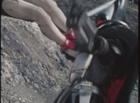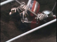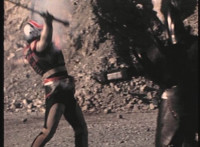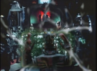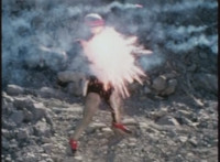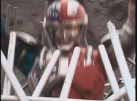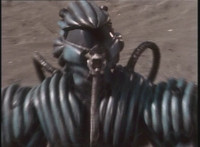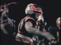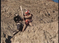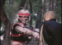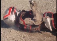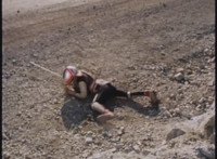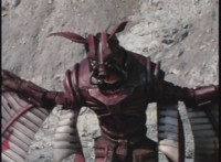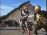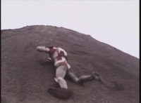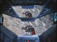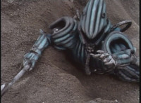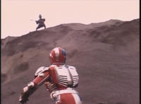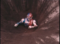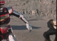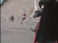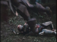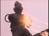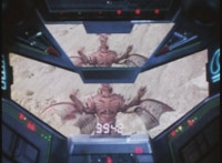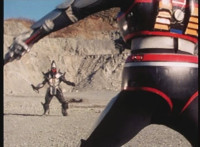 General Ivar aims his wrist gauntlet forth, firing bolts down upon VR JB, bursting him and around him. VR JB then rolls to the side, pulls out his Laser Pistol, and fires back, bursting Ivar, before Terminoid pops up and bites VR JB's arm until he drops his pistol. VR JB gets flipped over, landing in the quarry field, with General Ivar on one side and Terminoid on the other. VR JB looks at each opponent with his POV vision. |