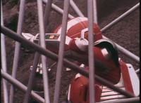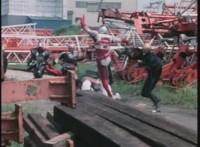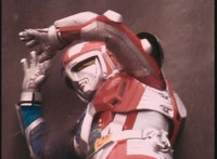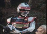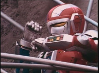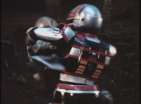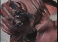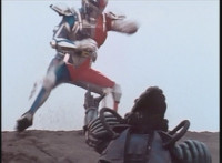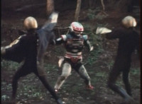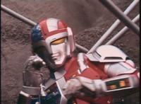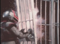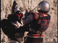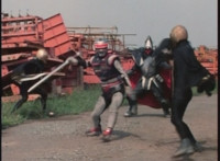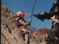Pinned down by Terminoid, VR JB glows, then kicks him off, gets up, goes to fight him, then Skugs rush in and he gets caught up combatting them. He grabs one's axe-wielding arm, holds it in a lock, and talks to the side. |