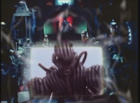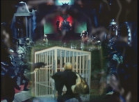 On Grimlord's energy screen, an image plays of Skugs & Terminoid terrorize a couple trapped in a cage. |