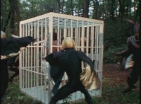 Skugs & Terminoid terrorize a couple trapped in a cage. |