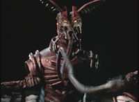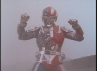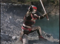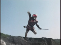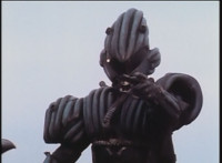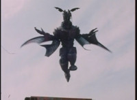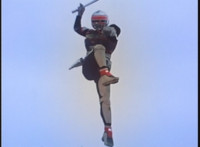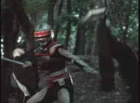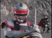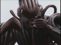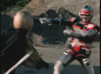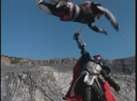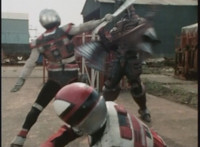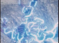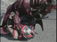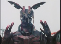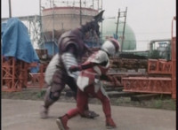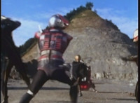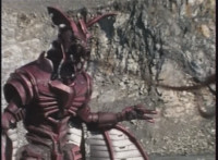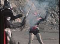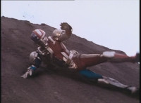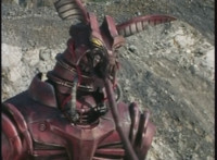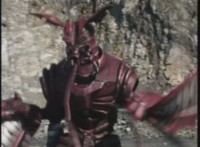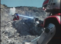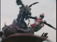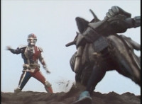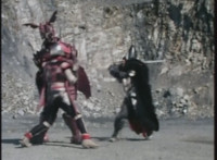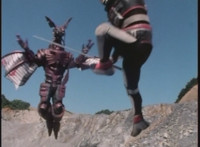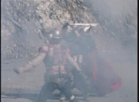 VR JB leaps in at Terminoid, who grabs him and pins him onto the ground, before lifting him back to his feet. VR JB struggles, Generlal Ivar rushes in and slashes at him but misses, so Terminoid flips VR JB over. Terminoid extends his tongue tentacle, spark bursts VR JB, who is dazed to the point General Ivar is able to sparkily slash him. Terminoid wraps his tongue around VR JB's right arm, allowing Ivar to come in and sparkily slash his back. VR JB tries to dodge his next blow, ending up flipped over by the monster, and when he's back on his feet, Terminoid flings VR JB free into the air, where Ivar sparkily slashes him again. He falls to the bottom of the quarry, General Ivar looking down on him. |
