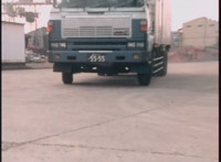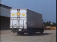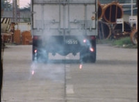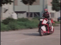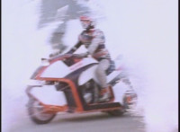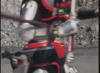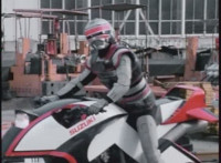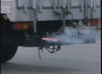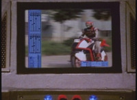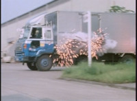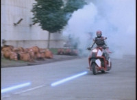 The truck begins firing sparks from its bumper, bursts erupting around VR JB on his Fighterbike, as he drives on, avoiding them all, and firing back, bursting the truck, causing it to swerve and crash. |