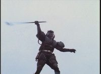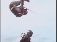 General Ivar leaps off a hill at VR JB, who lies on the ground and rolls out of the way, then locks blades with Ivar. |