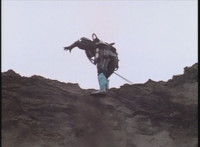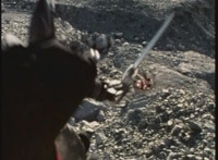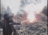 General Ivar ugestures at himself, and speaks. VR JB faces him from across the quarry. VR JB gestures, pulls out his saber hilt, and extends the blade. VR JB faces General Ivar with his saber ready, so Ivar charges in, the pair meeting in the middle, where Ivar slashes him down. He slashes again, VR JB rolls under, then blocks his blade with his own, holding him off until Ivar sparkily slices down his back. VR JB gets up and turns to face Ivar, they exchange blade blows, with the General getting the upperhand and eventually knocking him on his back. VR JB blocks his sword with his saber, then gets up and continues to spar with Ivar. General Ivar and VR JB break off their blade lock, VR JB ducks under Ivar's slash, blocks his next one, then gets bopped in the back and sent falling over the edge of the cliff. |
