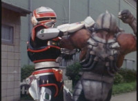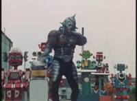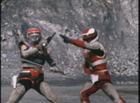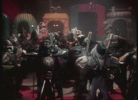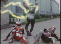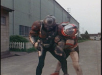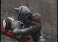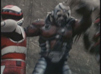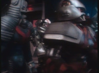 Zoom out from VR Kaitlin posing, as she unholsters her Laser Pistol. VR JB continues to grab hold of Samson, as he beats on him repeatedly. VR JB talks, until Samson shoves him off. VR Kaitlin reacts, as Samson stomps on VR JB, until VR Kaitlin jumpkicks in. Samson tackles her, VR JB tries to pull him off as he flips her over. Electrobot unleashes crackling energy, powering up Samson as he flips over both VR Troopers, then writhes. The warrior robots also get powered up, and roll off, never to be seen or mentioned again. |