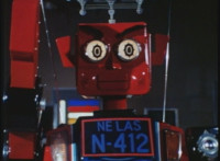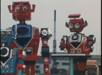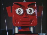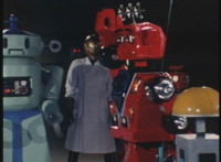 As labcoated Skugs watch, a red robot begins to walk to our left. |