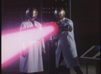 Labcoated Skugs fire the device, shooting lasers at the white robot, which slides out of the way just in time to avoid the sparks. |