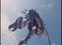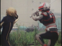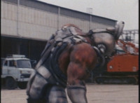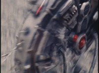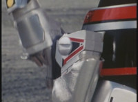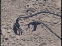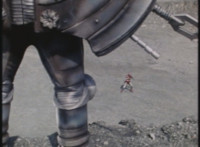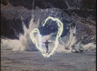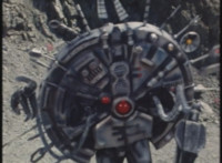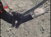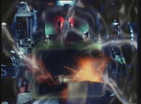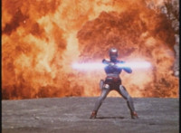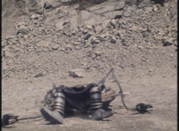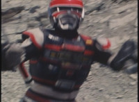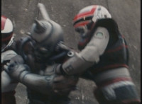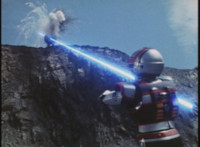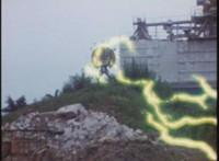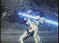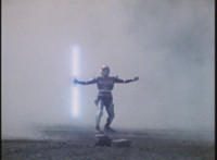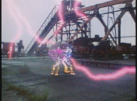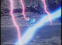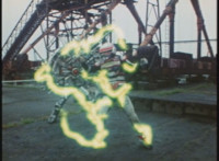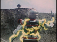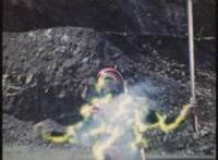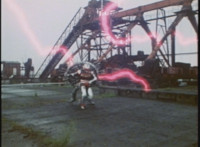 Electrobot stands atop a cliff, VR JB turns and looks upward from the quarry below, before pulling out his Laser Pistol. Electrobot zaps him, causing him to drop his Pistol, and writhe while crackling with energy, soon smoke bursting. VR JB spins around while agonized. |
