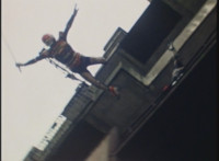 Continued, Samson shoves VR JB off, sending him flying off the side of a structure. |