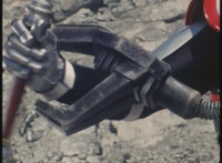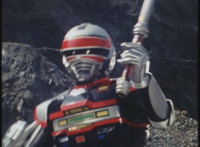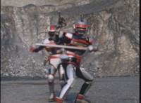 VR JB extends his Laser Lance upward into Electrobot, bursting him atop the cliff, and as soon as he retracts it, Electrobot falls off and lands in the quarry, but quickly recovers. |
