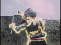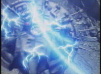VR JB keeps crackling, until he gestures his saber and turns it into a Laser Lance, then spins around and uses it to send the energy crackling on his body outward, bursting the ground all around him. Electrobot reacts, as VR JB stands with his Laser Lance, no longer crackling. |