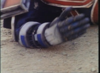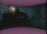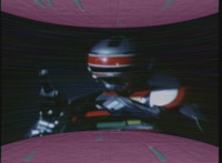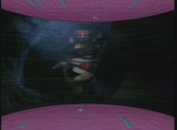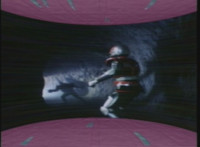 Sparks burst, and as they clear, VR JB, glowing initially, runs forth in a cave with a spotlight being shown on him, then readies his Laser Pistol, firing it at Rollbot, bursting him. |