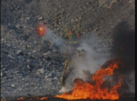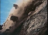 A dirt burst erupts on a cliff's edge, as another smaller burst erupts within. |
