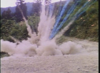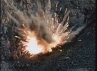An explosion brightly expands outward until it turns into a bursting of dirt and debris. |