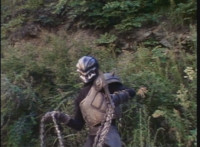 Mutant Drone is yanked by its own chain into the air, flying across and spontaneously exploding upon hitting the ground. |