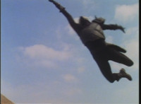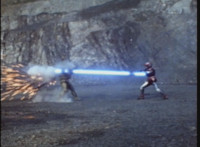 Upon being stabbed, Rollbot bursts, VR JB rushes forth, pulls his Laser Lance out, and twirls it. |