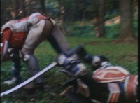 VR Ryan flips over Slice's slash, kicking him against a tree on the way over him. Slice quickly recovers, then tosses his sword at VR Ryan, who chops it down. |