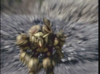 VR Ryan reacts, but quickly dodges Slice slashing at him. He then leaps up and lands on Slice, knocking him down momentarily. When both recover, VR Ryan kicks him in the neck, which dazes him for a second. Slice charges forth with his sword ready, but VR Ryan blocks, deflects, and flings him into the air. VR Ryan leaps up, a quick shot of a landmind in the ground, as VR Ryan lands beside Kaitlin's car and Slice lands on the landmind. |