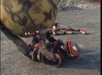 Rollbot ball lands on VR Kaitlin, pinning her down. VR JB rushes over and tosses it off of her, then helps her up. Rollbot ball rolls at them again, so both jumpkick him away. |