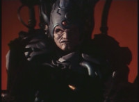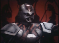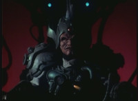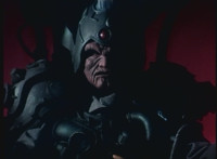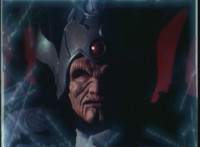 Sharp zoom in, close on Grimlord, talking as his eyes glow red, then his right fist clenches and glows red as well. |