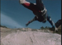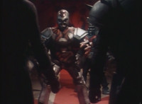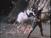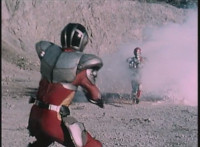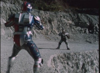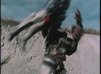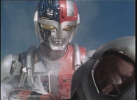 VR Ryan gets up, only to be sparkily blasted in the back by Renegade, who fires again on him, bursting around him as he rushes forth, leaps up, and bounds off his shoulders, knocking him down. He falls and rolls, turning back into Zelton, who stands up. |