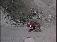 Zelton charges at VR Ryan, grabs him by the neck and flips him over, then grabs his head in a stranglehold, trying to crush his melon, until VR Ryan reaches up and breaks out of it. He tries to get up, but Zelton instead flips him over again, flinging him across the quarry. |