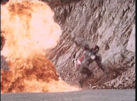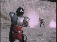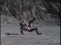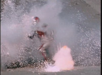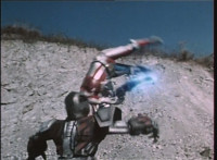 Zelton is agonized, as VR Ryan pulls his fist out of his chest and wobbles there. Zelton clutches his smoking chest, talks for a moment, then spreads his arms and charges forth. VR Ryan dodges him, so he stops, talks, then both leap up into the air and kick at one another, both hitting each other in midair and exploding! |
