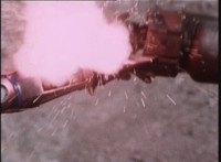 Close on a Gunbot and a Tankbot firing cannons forth. |