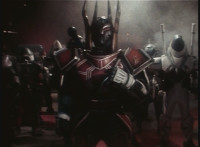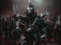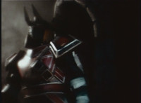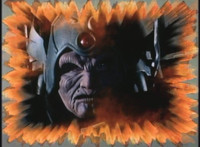 Sharp zoom in, close on Grimlord, talking as his eyes glow red, then his right fist clenches and glows red as well. |