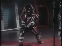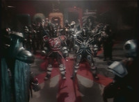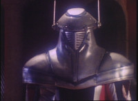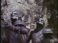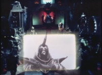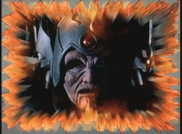 Grimlord's energy screen appears above the mutants in the Dungeon, forming an image of Dice whipping his weapon forth. |
