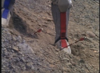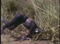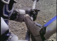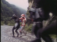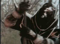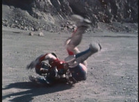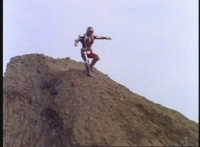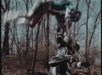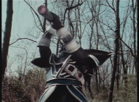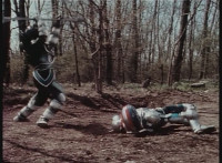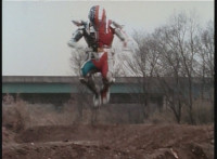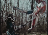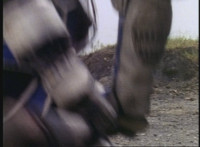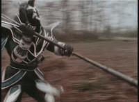 VR Ryan races down a hill, when Dice appears and fires his crossbow twice at him, landing arrows in front of his feet. Dice fires twice more, VR Ryan swats the arrows away, then leaps up and flips over as Dice fires two more arrows his way, missing. VR Ryan jumpkicks into Dice, knocking him down for a moment, before he rushes forth and slashes at VR Ryan with his lance, he ducks under, then puts his foot on his weapon, holding him in place. Dice reacts, VR Ryan talks, Dice speaks some, then jerks his lance upward, sending VR Ryan leaping up and bounding off Dice's back, knocking him down briefly. VR Ryan turns around and comes face to blade when Dice jabs his lance forth. They quickly pace to the side, VR Ryan at the end of Dice's lance. |