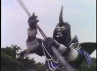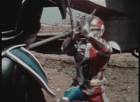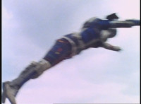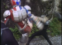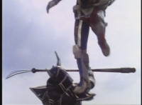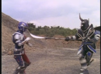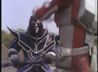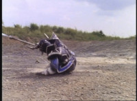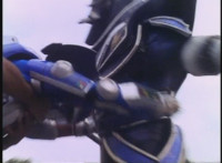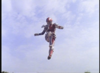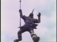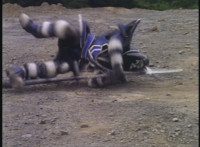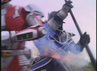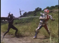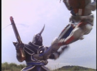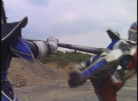 VR Ryan dodges Dice's lance, only to end up flipping over when he slashes again, but quickly gets up and out of the way when he strikes once more. VR Ryan then gets jabbed with the butt of the lance, and flipped completely over by it. Dice slashes his lance once more, VR Ryan stops the blade between his hands, holding it place. Dice struggles as VR Ryan slowly gets up with the blade between his hands, keeping hold of it for a bit until he jerks it to the side and throws a kick into Dice, knocking him away. |