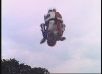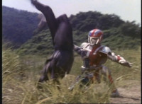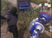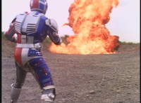 VR Ryan double punches into Dice, sending him flying back through the air, landing in a field, and exploiding massively as VR Ryan lands and watches, nod-talking during a zoom in. |