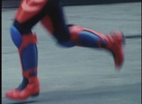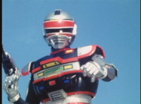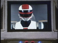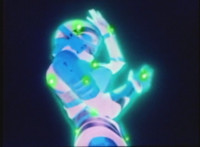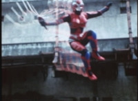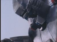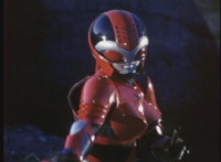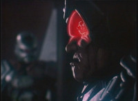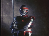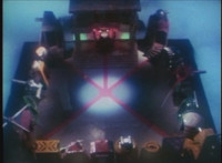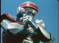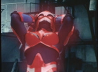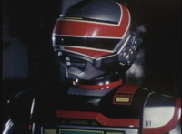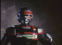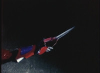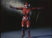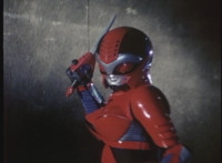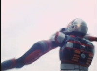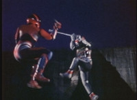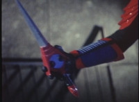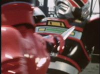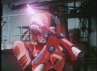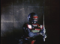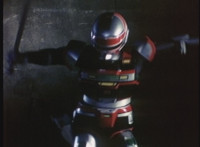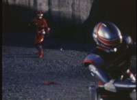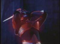 VR JB charges forth with his saber at the ready, Red Python doing the same with her dagger, the pair about to clash, when she turns into a spectrum sparkle mass, which flutters about, vanishes for a moment, VR JB glancing about, before the sparkles return and Red Python rematerializes with a slashing against him. VR JB staggers back, smoking, as Red Python ceases glowing, and begins to approach him. He stands defensive, as Red Python gets closer, until she suddenly begins to pulsate and writhe. VR JB reacts, as she grasps her helmet and spins about. VR JB readies his saber. |