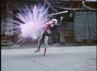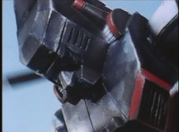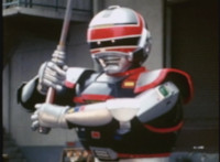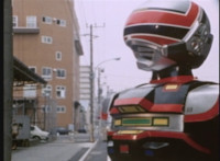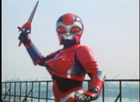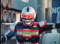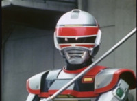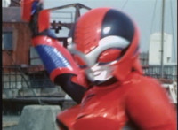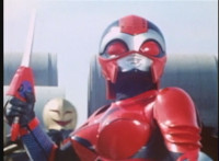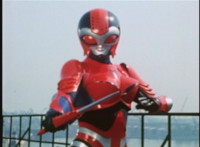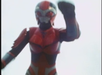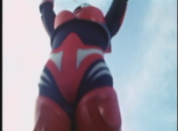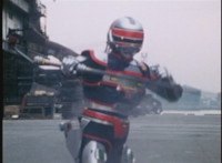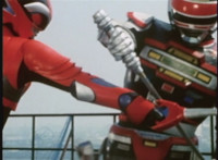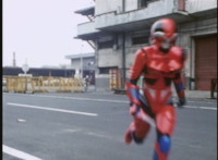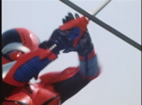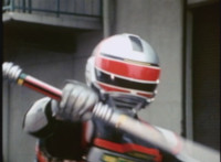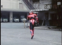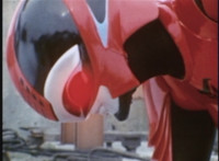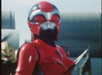 Red Python leaps through the air, body trailing, lands, VR JB posing defensively, as Red Python prepares to strike, when she suddenly starts pulsating and clutching her helmet. VR JB watches, as she's overcome with her internal problems. VR JB rushes forth to attack, and despite being in agony, Red Python charges up her dagger and flings a bolt of energy at him, pink smoke-bursting him down. She runs away, as he gives chase. |