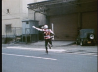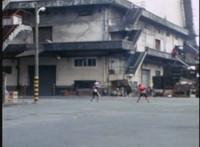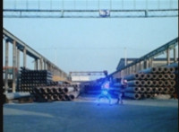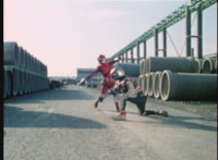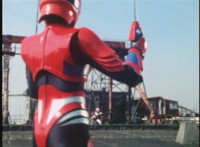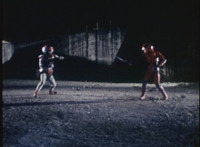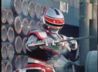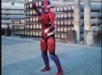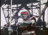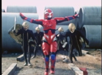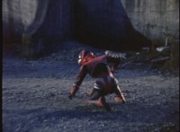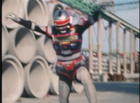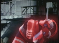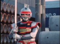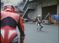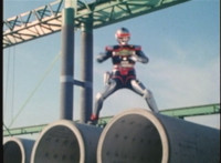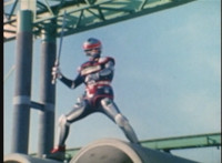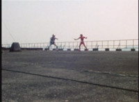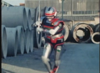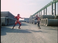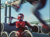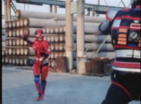 Red Python poses while looking upward while Skugs dance about behind her. VR JB poses atop a girder, which she reacts to. VR JB poses again, and whips out his Laser Pistol. Red Python flings an energy bolt up at him, bursting pink smoke, so he returns fire, blasting at her, but she stands there and takes the blasts like they were nothing. VR JB poses, and reacts, before Red Python leaps up, and takes VR JB down from his perch, the pair falling and rolling into an area with cement pipes. Red Python strikes at him, he dodges, then gets knocked off his feet, she tries to attack while he's down but he rolls away. He gets up, she knocks him back down for a roll. VR JB gets back up, leaps over Red Python, lands on some cement pipes, and poses with his saber hilt, then whips it out and poses with it. |