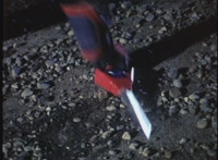 VR JB and Red Python race out into a lot, where they resume fighting, VR JB readying saber and preparing to slash. |
