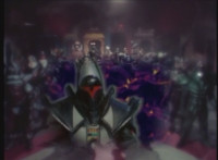 VR JB motions his arms about while his body trails, until he erupts into sparkle particles that reassemble as a giant energy image of him using the VR Techno Bazooka, firing both cannons forth. |