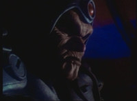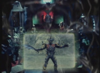 Grimlord's energy screen above the mutants in the Dungeon, shows an image of Colonel Icebot as he talks close with a fist raised that he slowly begins to lower. |