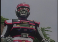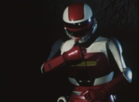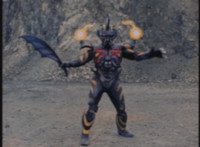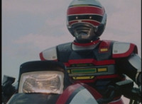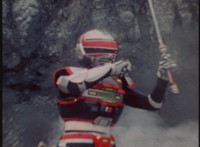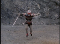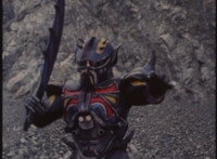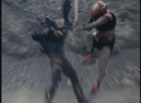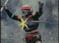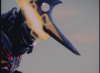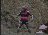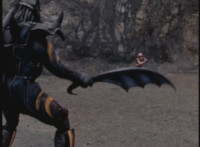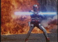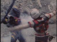 Energy slashed, Sharkfin cracles, VR JB finishes slashing him, then turns about face and poses as Sharkfin collapses and explodes massively. |
