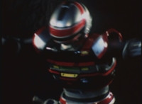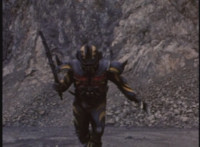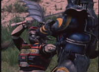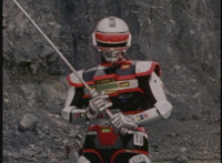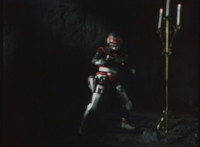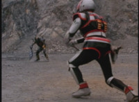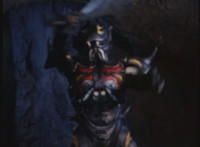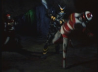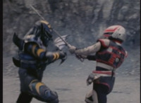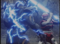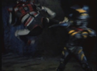 VR JB faces Sharkfin, who quickly rushes forth, VR JB following suit, both making contact with their blades in the middle. VR JB sparkily slashes Sharkfin, then they lock blades again, before Sharkfin smacks him aside. VR JB blocks his fin blade with his saber, leaving him open to be sparkily slashed by the mutant, then knocked down by his blade. VR JB falls and rolls, recovering then leaping forth and flipping over Sharkfin, hitting him on the back on the way by. VR JB lands and poses, talking, as Sharkfin slaps his fin blade on the ground. |